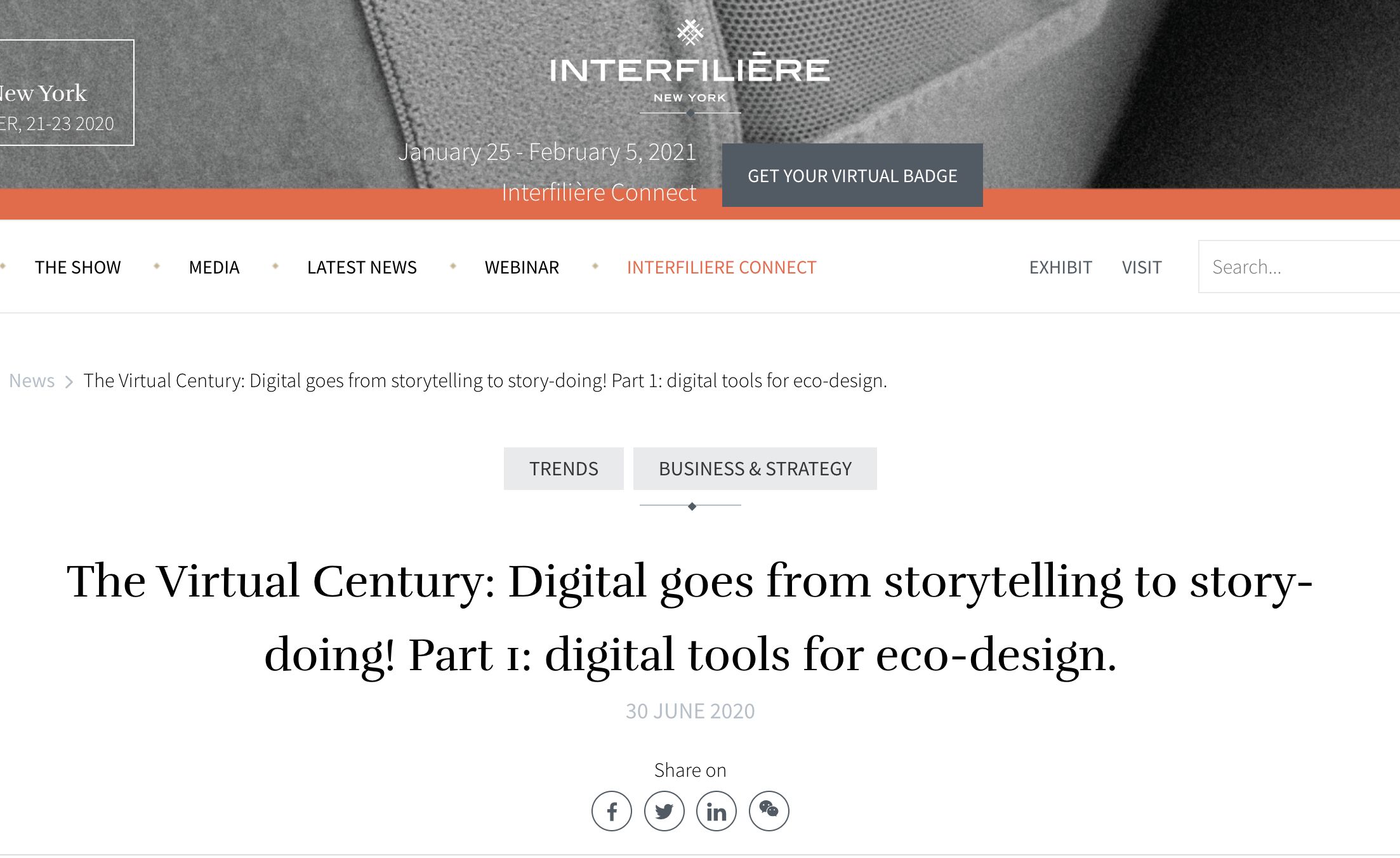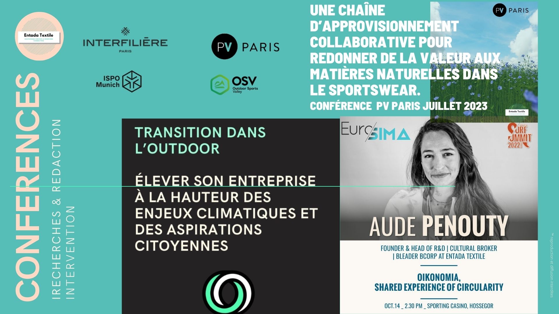 Pour des salons internationaux tels que Première Vision Paris, nous proposons des éditos et des réalisations de tables rondes et conférences sur le textile durable et les innovations en rapport avec les législations (CSRD, AGEC, loi climat et résilience, double matérialité, devoir de vigilance, comptabilité extra financière). Pour les tables rondes, nous écrivons le pitch et réalisons les interviews préparatoires avant de proposer une série de questions et d’éléments visuels qui viennent appuyer la prestation sur site.